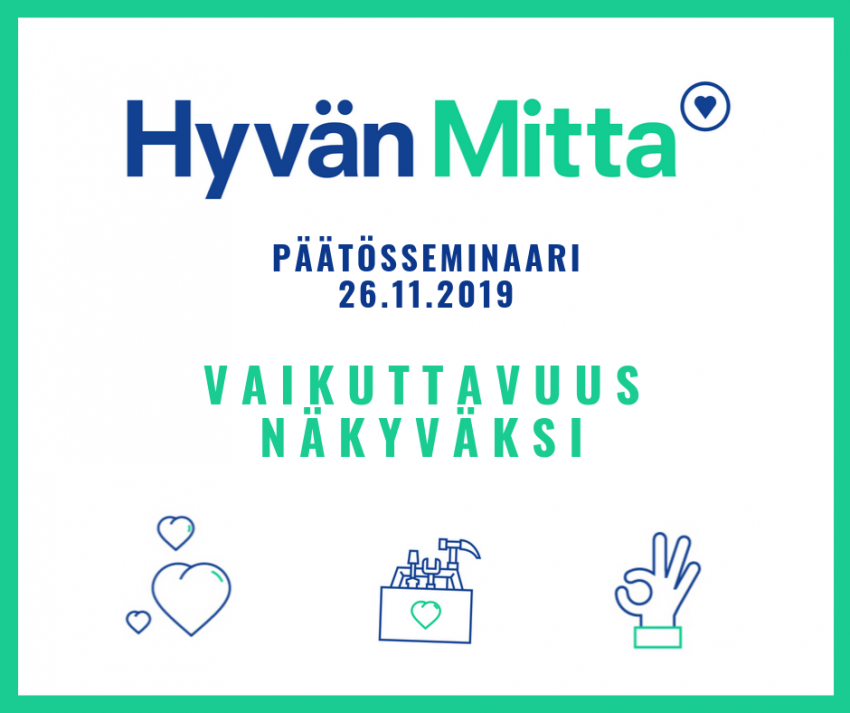 Näihin kysymyksiin on haettu vastauksia Hyvän Mitta -hankkeessa. Tervetuloa hankkeen päätösseminaariin 26.11. klo 12.30 – 15.30 Helsinkiin Kulttuuritehdas Korjaamolle.Tilaisuus on maksuton ja avoin kaikille yhteiskunnallisen vaikuttavuuden kanssa töitä tekeville ja asiasta kiinnostuneille. Varaa paikkasi ilmoittautumalla lomakkeella tämän sivun lopussa.